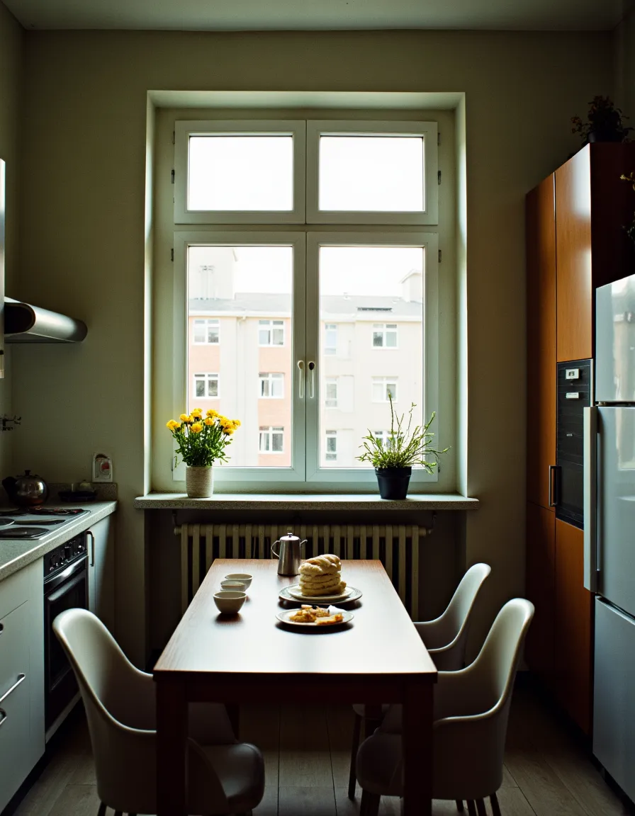 A 1990s Russian apartment kitchen highlighted by a large window overlooking neighboring apartments. The wooden dining table at the center has stacked bread, a metal kettle, and two bowls, surrounded by four modern white chairs. Two flowerpots with bright yellow and green plants sit on the windowsill above a traditional radiator. The kitchen is equipped with white countertops, stove, wooden upper and lower cabinets, and a silver refrigerator. The lighting casts a warm, natural ambiance, bringing attention to the blend of utilitarian design and homey details typical of that era.