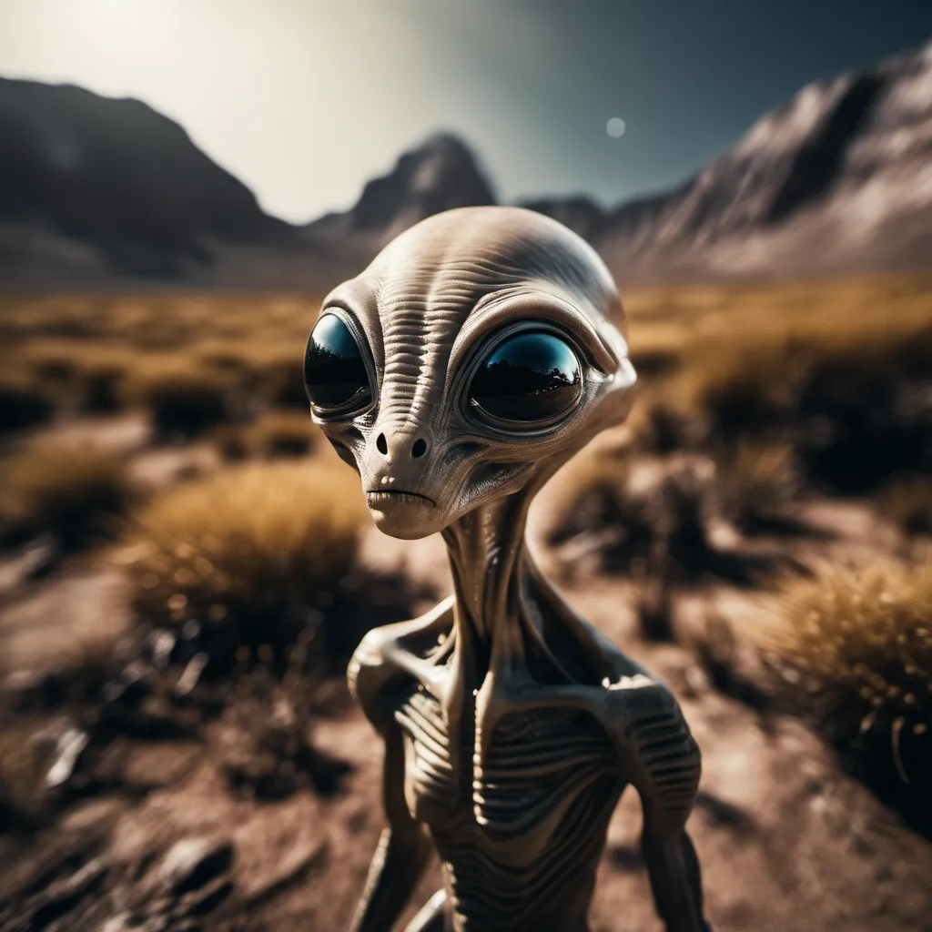 Close-up view of a curious alien face with large, glossy black eyes and ribbed, textured skin. The alien stands in a barren, rocky landscape dotted with alien flora under a clear sky, framed by distant mountains. The image is captured using a wide angle lens to emphasize the alien's features and give a sense of scale to the alien world. Film grain adds a photographic realism effect, portraying a high-detail scene as if recorded by an interstellar probe exploring an alien planet.