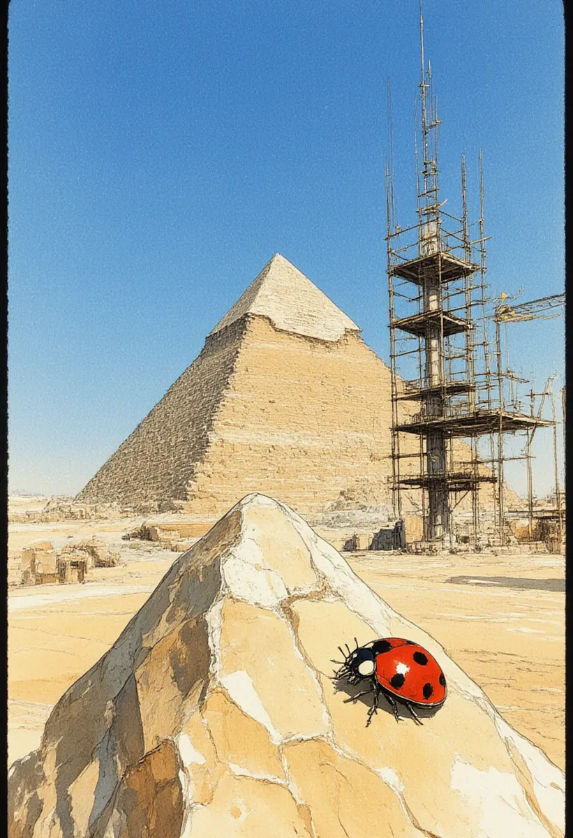 beautiful illustration,, in the style of cksc, Ancient Egypt, bright noon. In the foreground, at the bottom of the frame, there is a pointed light yellow stone with a ladybug sitting on its edge. In the background, there is a blue sky, and in the out-of-focus distance, there is the construction of Egyptian pyramids, with unfinished pyramids, ancient Egyptians, and scaffolding. , . masterpiece, best quality, ,detail. charismatic., 8K, . j_art, stylized illustration by Incase . ,InkWatercolor style sketch. nigiex. illustration-fen, j_art, (Depth of field), low saturation,detail. GLSHS,, vantablack
