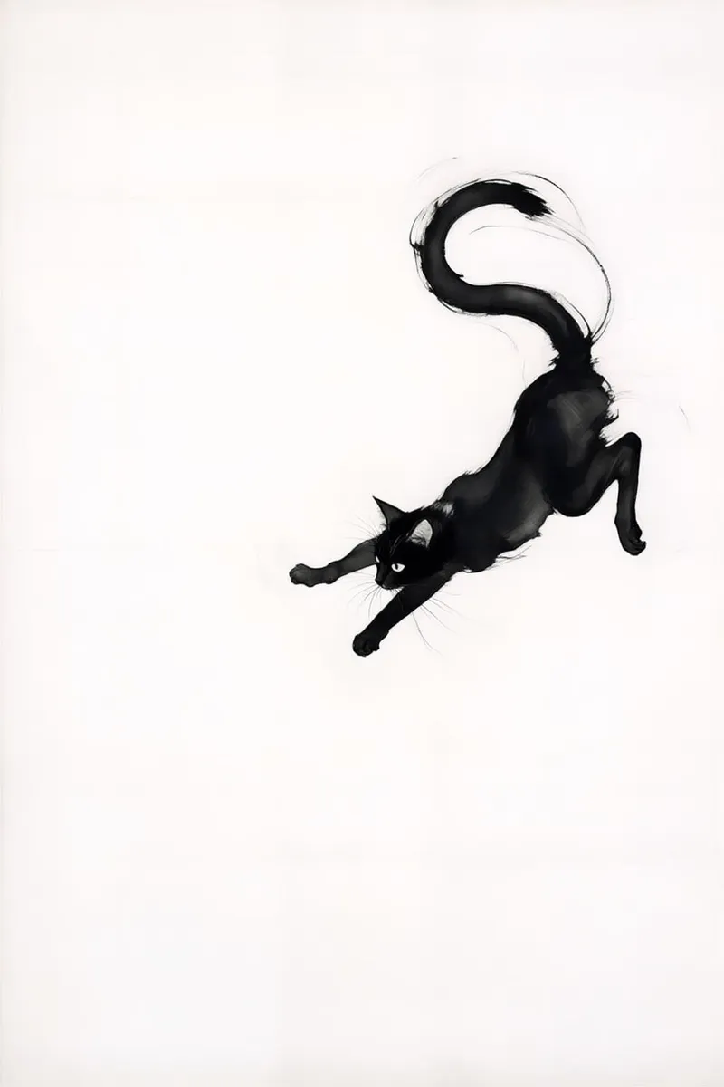 Black cat captured mid-air in a dynamic jump depicted through minimalist ink illustration with clean brush strokes. The silhouette is defined with fluid, varying line thickness mimicking traditional calligraphy and brush-and-ink style. The cat is shown in side profile with arched back, extended front paws, and a flowing tail, rendered in solid black ink details for ears and eyes, contrasted against a stark white background without shading or additional background elements. The composition focuses on elegant, rhythmic feline motion with a serene and sophisticated mood.