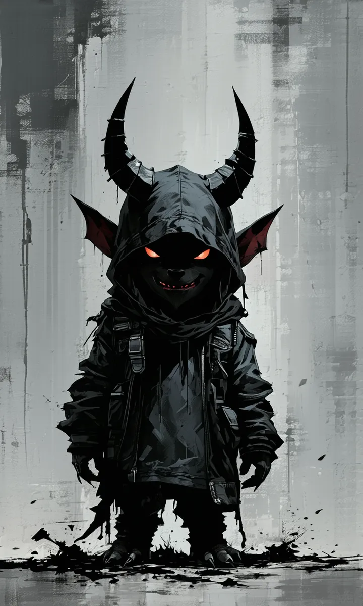 A bleak, highly detailed dystopian scene featuring a small demon with glowing orange eyes and sharp fanged grin. The demon is clad in a dark, oversized hooded jacket with tactical elements like straps and pouches, conveying a war-ready appearance. Its prominent curved horns and pointed ears contrast sharply with the worn and damaged clothing. The background portrays a somber, post-apocalyptic atmosphere with textured grey and black abstract patterns, enhancing the grim and dramatic mood. Black debris and splatters around the figure's feet complete the desolate war-torn environment.