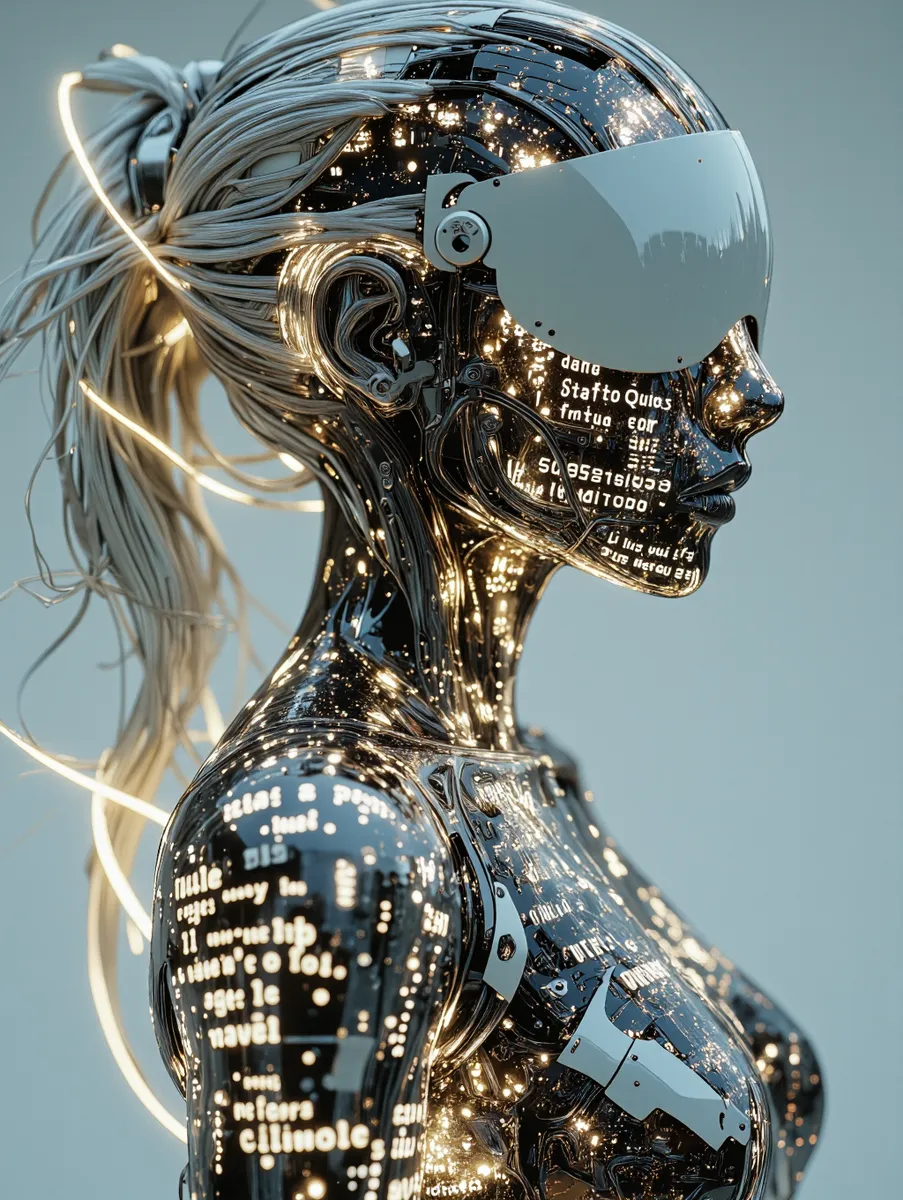 A futuristic female android rendered in a hyper-detailed sci-fi style, portrayed from a three-quarter side view, her body turned slightly away from the viewer, head tilted downward in a calm, introspective pose. Her form is sleek and elegant, built from transparent glass-like material with internal mechanical structures and glowing circuitry visible beneath the surface. Her body is semi-translucent, illuminated from within by soft white and silver light, and covered in floating holographic text and symbols that move across her form like streams of digital data. These inscriptions wrap around her body in various alphabets and code fragments, symbolizing information flow or cybernetic consciousness. She wears a smooth, futuristic visor that covers her eyes completely, reflecting a soft golden glow at its edges, merging seamlessly with her metallic face. Her hair flows back gracefully, composed of fine, silver strands that look like light filaments, frozen in mid-motion, catching the surrounding luminescence. The lighting is highly stylized — strong contrast between the glowing edges of her body and the deep black background, giving her a luminous, almost ethereal appearance. The composition centers on the upper torso and head, emphasizing the interplay between organic curves and machine precision. The style is ultra-polished, a mix of cyberpunk realism and digital surrealism, with smooth textures, chrome reflections, and intricate mechanical detail. The image evokes a sense of quiet strength and melancholy — a vision of an advanced synthetic being suspended between human grace and technological perfection.