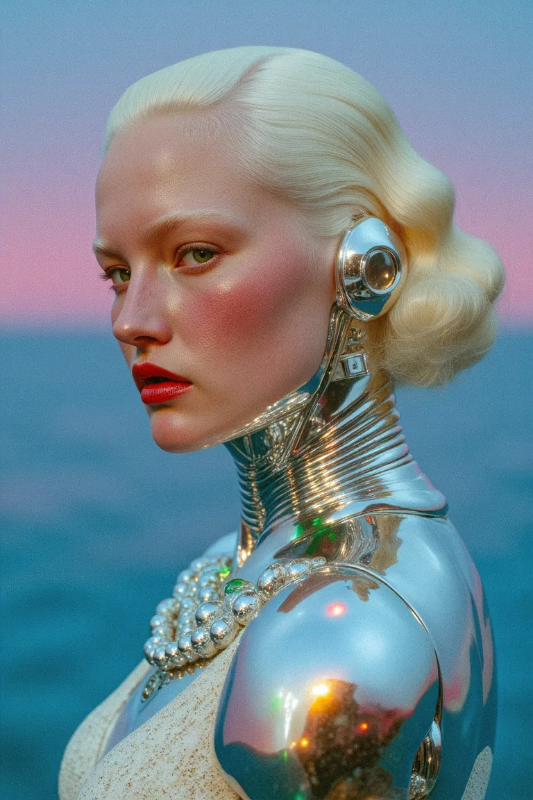 A striking cinematic portrait of a futuristic woman showcasing smooth ivory skin with bluish undertones and natural rose-tinted lips. The left side of her body features intricate chrome augmentation covering her neck and shoulder with realistic feminine curves and glowing emerald light accents. Her hair is styled in a shimmering bob that shifts colors in a holographic oil-on-water effect. A transparent crystalline implant spirals delicately around her neck. The background presents an atmospheric gradient blending ocean blues with neon pinks, softly blurred with shallow focus and enhanced by natural cinematic lighting and subtle analog texture. The surreal yet muted color palette complements the futuristic elegance.