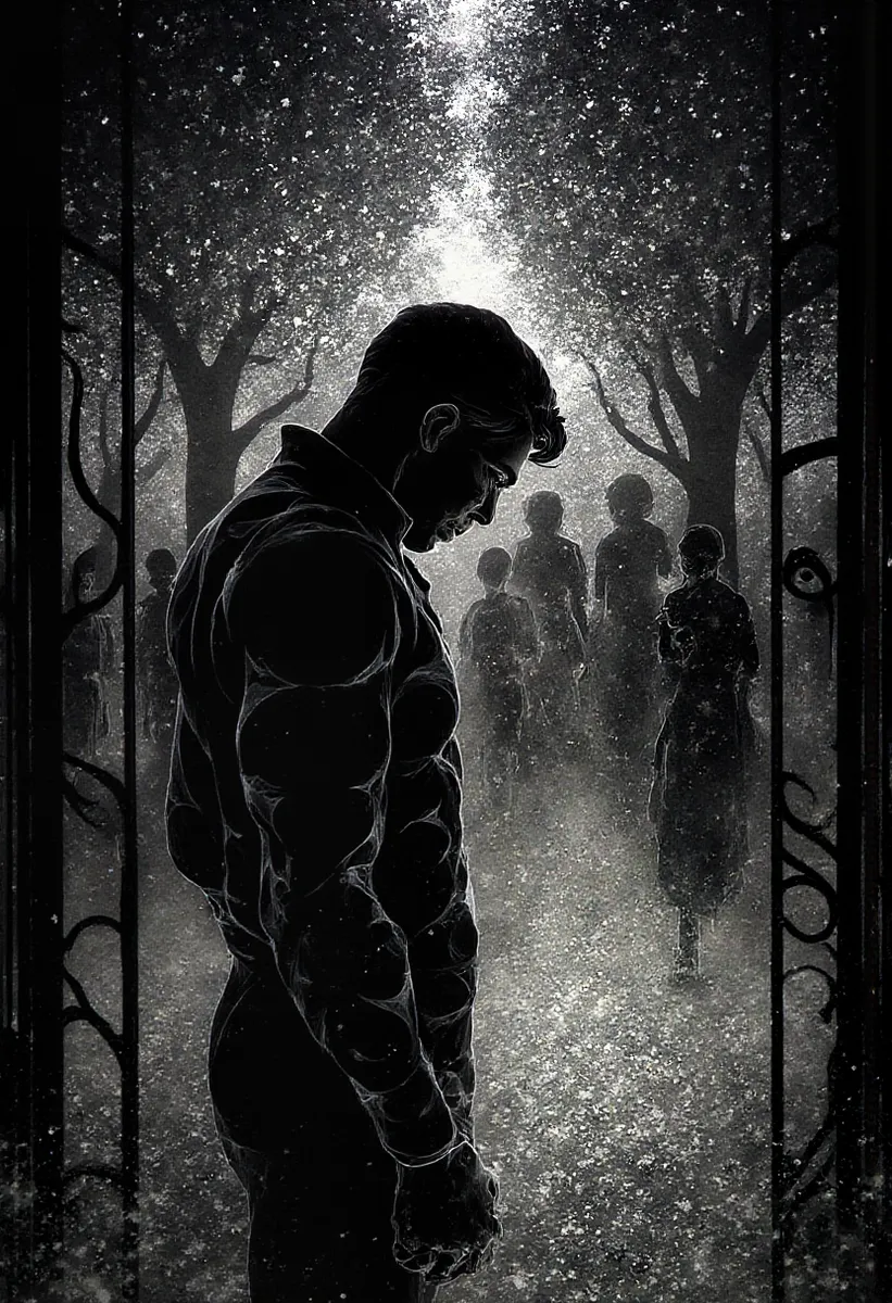 A monochrome painting in ArsWorldOfDarkness style depicting a muscular man standing with bowed head before iron gates surrounded by trees. The man’s silhouette is sharply outlined, expressing melancholy and ostentatious pride as he gazes on distant shadowy figures of elegantly dressed nobles walking along a tree-lined avenue. The artwork uses stark contrasts and subdued textures to capture the theme of unfulfilled ambitions and social exclusion following a disillusioning experience at the ill-fated vanity fair. The scene radiates a haunting atmosphere where pride becomes a shadow dogging the man, separating him from the privileged life behind the gates.