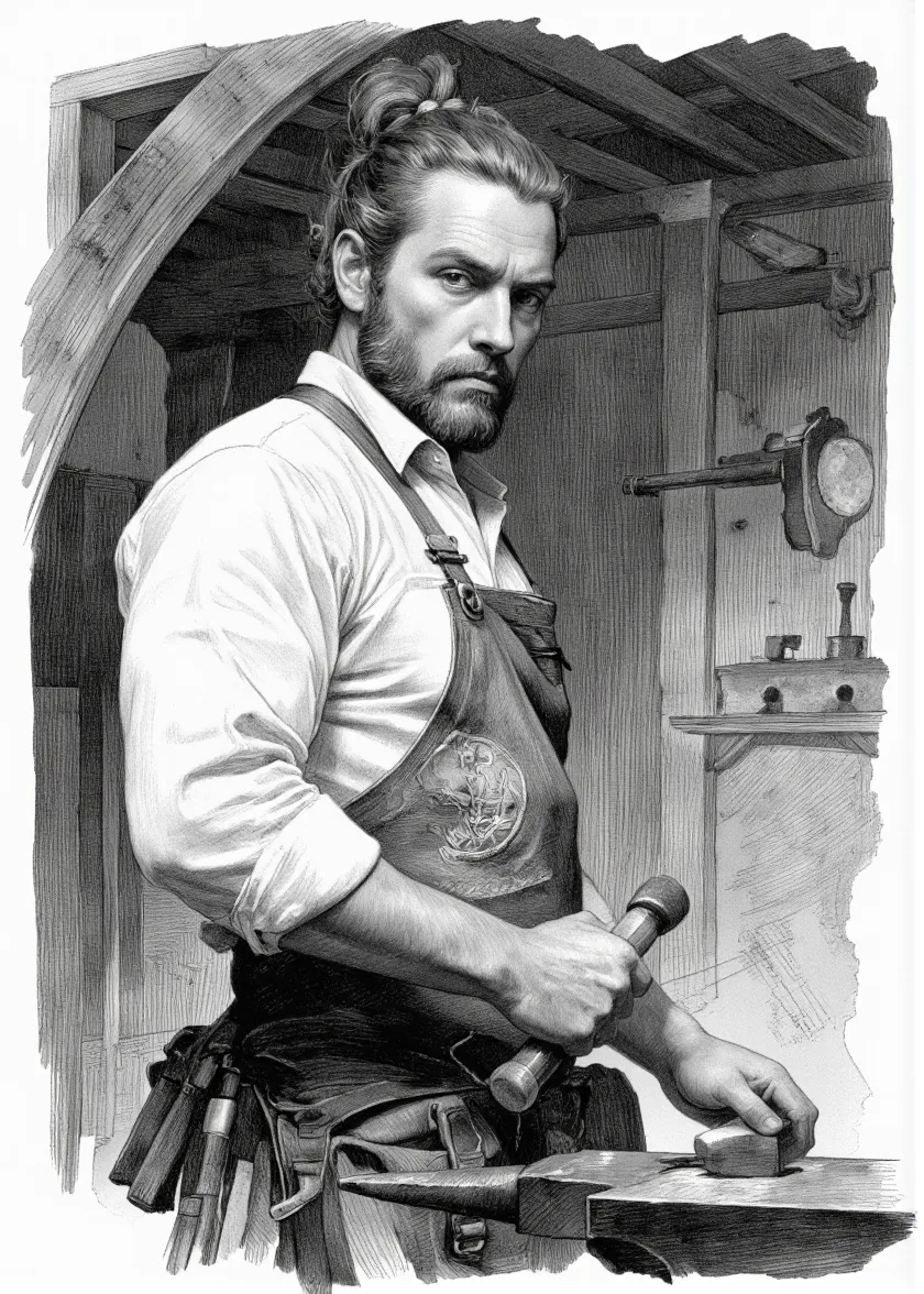 A very detailed, realistic black and white sketch capturing a muscular man with a beard and tied hair, dressed as a blacksmith. He is wearing a loose shirt and a leather apron emblazoned with an intricate emblem, holding a blacksmith's hammer poised to strike an anvil. The man, appearing around forty-five years old, gazes seriously with determination and strength from a profile view. The background features a wooden blacksmith workshop interior, including tools and rustic architectural beams, enhancing the craftsmanship atmosphere.