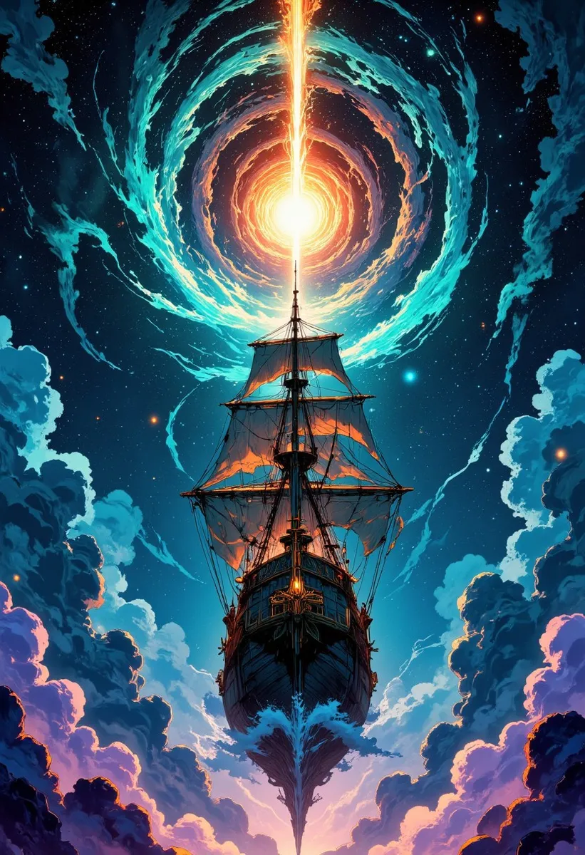 A majestic tall ship reminiscent of the Age of Sail navigates through a luminous, swirling space vortex in the sky. Its full sails reflect the warm glow of the vortex while surrounded by an intense storm of glowing clouds and embers. Vivid cosmic colors — blues, purples, and golds — blend to create a surreal and dramatic atmosphere. The vortex pulses with celestial energy, illuminating the ship’s highly detailed structure and sails. Waves of light and stars swirl around, depicting a fantastical journey caught between space and time with fantasy realism and cinematic composition blending to produce a high contrast, epic visual storytelling scene.