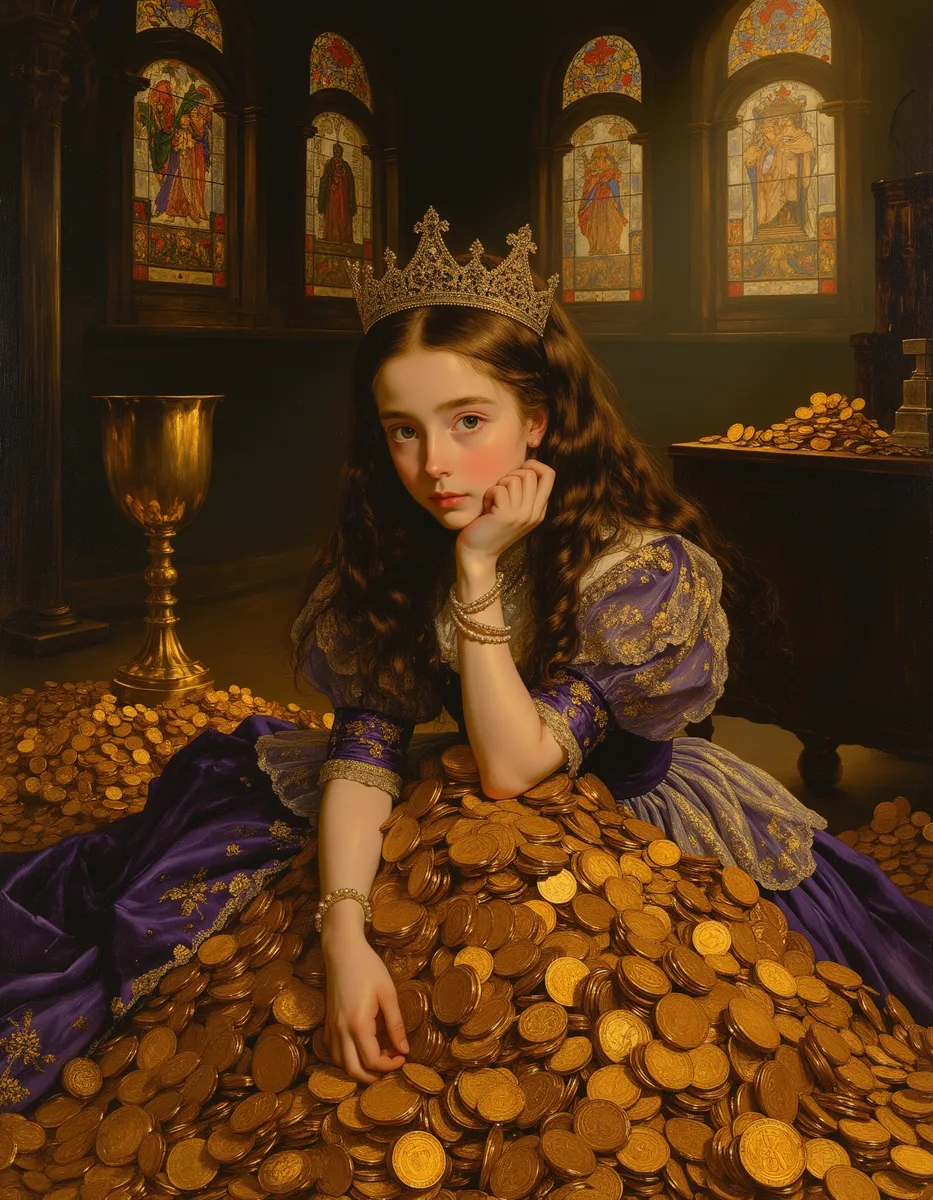 A young tween princess with delicate, ethereal white skin and long brown hair is seated on a large mountain of gleaming gold coins, wearing an ornate jewel-encrusted crown and a flowing purple silk dress with gold brocade details, corseted and hooped with a bustle. She rests her chin thoughtfully on her hand in a classic thinking pose. Around her are overflowing treasure chests, golden chalices, and strands of pearls scattered in an opulent treasury chamber. Dramatic warm golden light filters through stained glass windows creating colorful patterns on the walls. The image evokes a melancholic yet magnificent atmosphere in the style of Rembrandt with intricate brush strokes, balanced lighting, and a magical, cinematic quality.