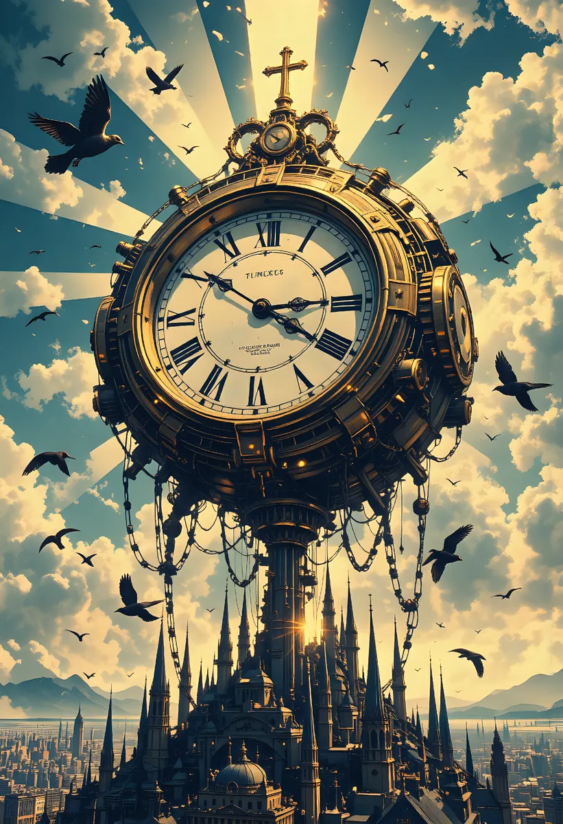 Colossal golden floating clock featuring intricate Roman numerals and a cross on top, suspended above a large city of spires and towers resembling Gothic architecture. The clock is supported by chains and mechanical parts, with glowing golden gears and mechanisms slowly rotating around it. Bright rays of sunlight stream through clouds and cracks in the clock face, illuminating the city below. Numerous birds fly through the sunbeams, adding dynamic motion and life to this surreal fantasy scene. The lighting is vibrant, detailed, and cinematic, evoking a dramatic and mystical atmosphere blending retro anime and Gothic art styles.