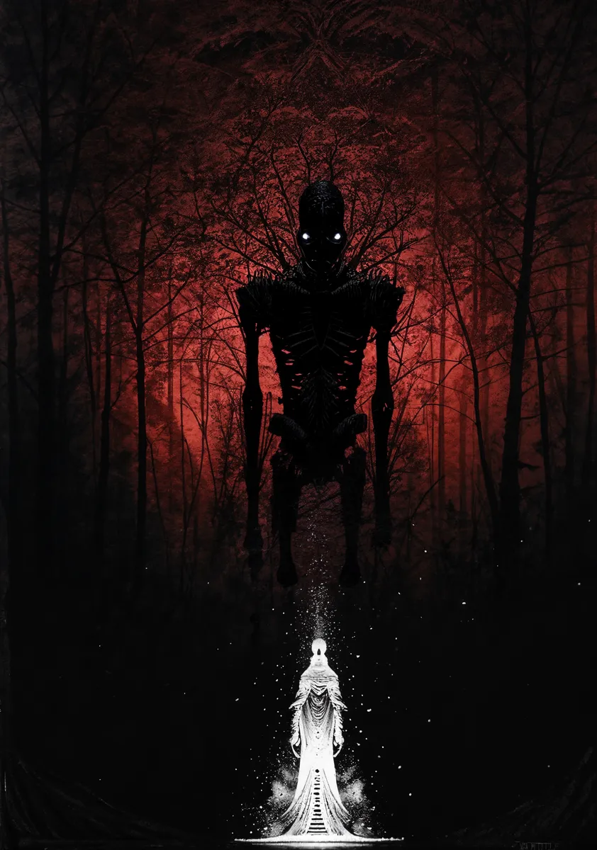 A hyper realistic medium full shot featuring a genetically-engineered being with glowing eyes, towering in a dark forest illuminated by a deep red background. The being exhibits intricate, skeletal organic armor with sharp, bold lines, embodying a dynamic pose as it looks directly at the viewer. A white luminous figure, radiating energy particles and wearing a long, detailed robe, stands facing the towering being in the foreground, creating a strong contrast with the dark red and black surroundings. The composition uses a wide angle panoramic view and dark limited color palette enhanced by incident lighting and depth of field to emphasize the eerie atmosphere and high detail inspired by DarkSpheraStyle with hyper detailed artistic rendering.