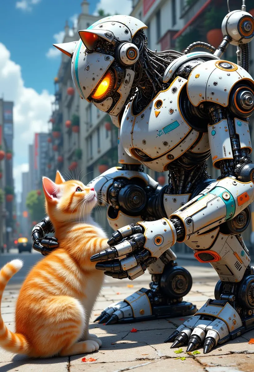 A highly detailed and vibrant scene featuring a robot cat with white and metallic armor plating, glowing orange eyes, and intricate mechanical joints. The robot cat is interacting tenderly with a real, orange tabby cat sitting on a paved city street. The tabby cat looks up curiously at the robot. The background suggests an urban environment with tall buildings and a clear blue sky. Visual style is influenced by anime artwork and the Smooth_Mix_-_Flux_v.2 LoRA model, emphasizing clean lines and a studio anime aesthetic. The scene depicts a warm interaction bridging technology and nature, with focus on textures, lighting, and emotion.