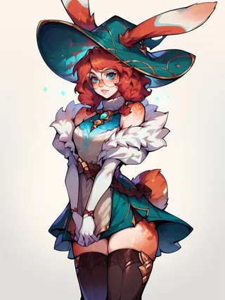 score_9, score_8_up, score_7_up, score_6_up, score_5_up, <lora:AuroraLOLXLP:1> auroralol, 1girl, solo, rabbit ears, round eyewear, blue eyes, freckles, hat, gloves, tail, thighhighs, red hair