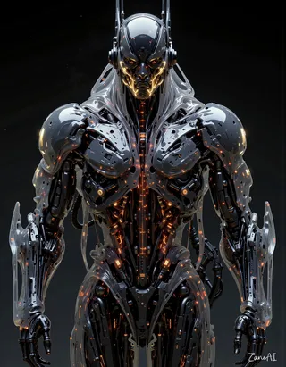 “Futuristic bust encased in clear resin with tiny air bubbles, dramatic backlight.”
