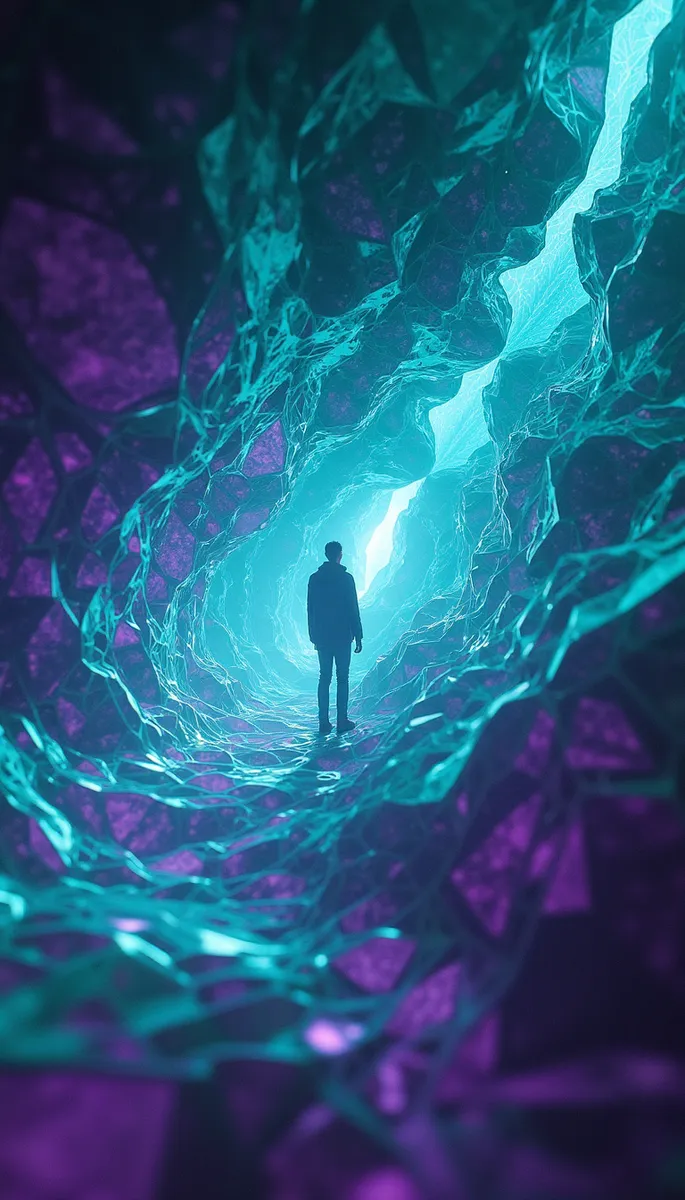 A silhouette of a person stands inside a glowing tunnel composed of chaotic turquoise and purple polygons. These polygons form a fractal-like, crystalline structure that seems to warp space, symbolizing a breakthrough into another dimension driven by strong willpower. The scene uses depth of field to emphasize the tunnel's depth and the unusual angle of view adds a dynamic, immersive feel. The combination of vibrant turquoise and purple hues with a translucent polygonal network evokes a stylish, sci-fi ambiance.
