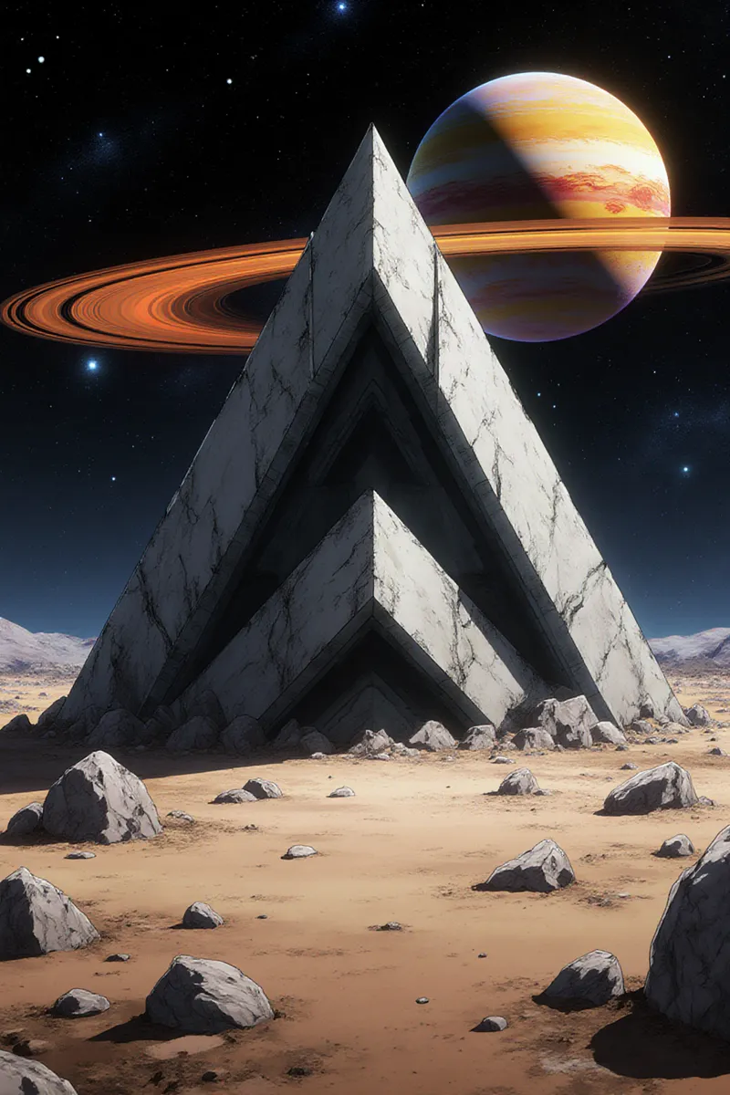 Sharp image of anime style of a digital illustration of a futuristic landscape with a large, triangular structure in the center. The structure appears to be made of stone or concrete and has a pointed top. It is surrounded by a vast expanse of barren land with rocks and boulders scattered around. In the background, there is a planet with a ring of orange and yellow hues, representing the colors of the planet's surface. The sky is filled with stars and planets, and the overall mood of the image is dark and mysterious. Anime art.