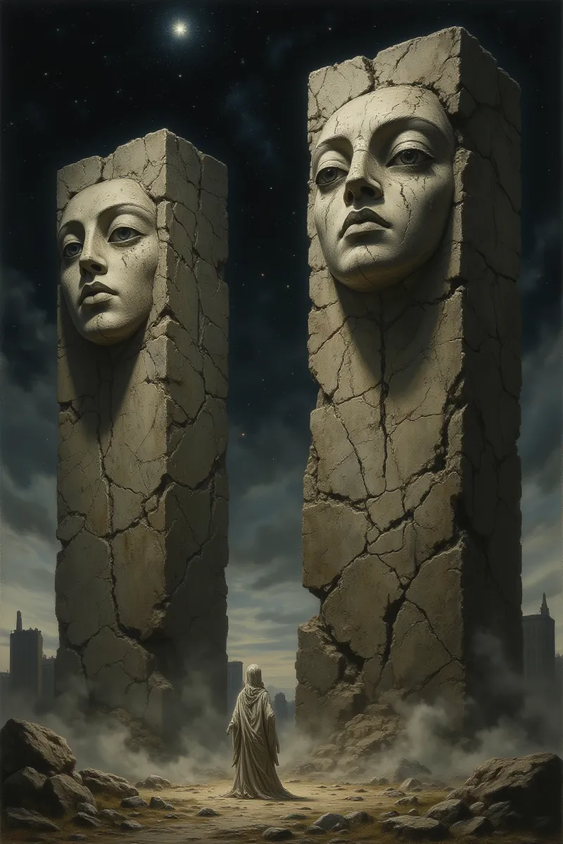 Two massive monolithic stone statues with serene, cracked faces rise dramatically under a starry night sky. Each statue is rectangular and ancient, featuring weathered textures of ivory, gray, and light brown hues that emphasize their monumental scale. In front of these immense statues, a small robed figure stands in awe, enveloped in a misty haze that adds an eerie and mysterious atmosphere. The lighting is dramatic and carefully highlights the statues' detailed facial features, helping blend a realistic and fantasy aesthetic. The setting is vast and atmospheric, with rocky terrain and subtle hints of distant city silhouettes framed by the atmospheric haze, enhancing the epic and enigmatic scene.